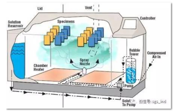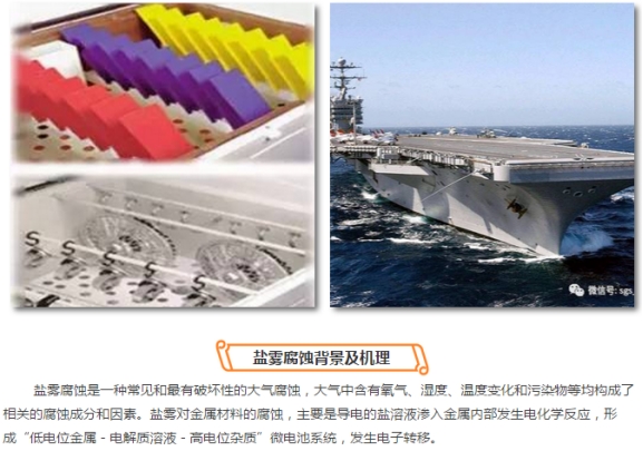 盐雾腐蚀是一种常见和最有破坏性的大气腐蚀,大气中含有氧气、湿度、温度变化和污染物等均构成了相关的腐蚀成分和因素。盐雾对金属材料的腐蚀,主要是导电的盐溶液渗入金属内部发生电化学反应,形成“低电位金属-电解质溶液-高电位杂质”微电池系统,发生电子转移。