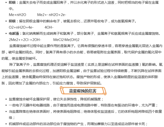 盐雾腐蚀破坏过程中起主要作用的是氯离子。它具有很强的穿透本领,容易穿透金属氧化层进入金属内部,破坏金属的钝态。同时,氯离子具有很小的水合能,容易被吸附在金属表面,取代保护金属的氧化层中的氧,使金属受到破坏。