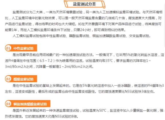 人工模拟盐雾试验包括中性盐雾试验、醋酸盐雾试验、铜盐加速醋酸盐雾试验、交变盐雾试验。