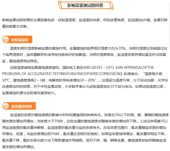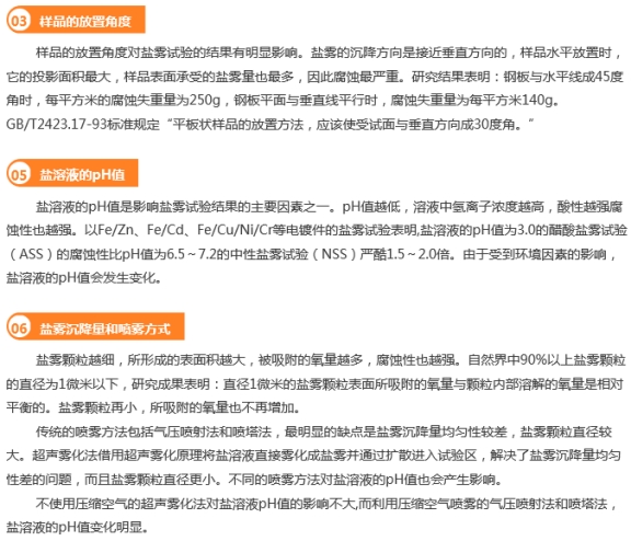 影响盐雾试验结果的主要因素包括:试验温湿度、盐溶液的浓度、样品放置角度、盐溶液的pH值、盐雾沉降量和喷雾方式等。