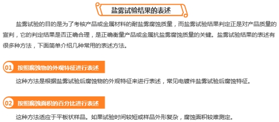 盐雾试验的目的是为了考核产品或金属材料的耐盐雾腐蚀质量,而盐雾试验结果判定正是对产品质量的宣判,它的判定结果是否正确合理,是正确衡量产品或金属抗盐雾腐蚀质量的关键。盐雾试验结果的表述有很多种方法,下面简单介绍几种常用的表述方法。