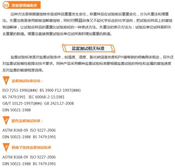 盐雾试验标准是对盐雾试验条件,如温度、湿度、氯化钠溶液浓度和PH值等做的明确具体规定,另外还对盐雾试验箱性能提出技术要求。同种产品采用哪种盐雾试验标准要根据盐雾试验的特性和金属的腐蚀速度及对盐雾的敏感程度选择。