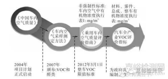 GB/T27630 规定了车内空气中苯、甲苯、二甲苯、乙苯、苯乙烯、甲醛、乙醛、丙烯醛的浓度要求,给出了汽车车内各 VOC 污染物的限值标准。该指南引导汽车企业开展车内 VOC 控制工作,但引起的争议也暴露出我国在汽车挥发性有害物质管理方面仍面临一系列问题,且指南只针对我国整车的 VOC 标准,汽车的原材料和零部件并无相关国家标准,没有从源头控制 VOC 的排放问题。图 1 展示了我国汽车VOC 检测相关标准发展历程,表明我国的汽车 VOC检测相关标准还有很多需要完善的地方。