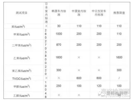 不同车系相应不同的测试标准,包括德国PV3938标准、日本《车内VOC试验方法》、俄罗斯GOST R51206-2004标准以及国内《车内挥发性有机物和醛酮类物质采样测试方法》即HJ/T 400-2007测试标准,具体测试条件如下: